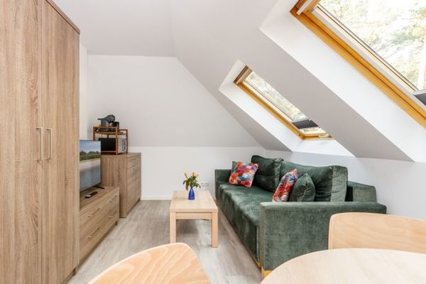 Ein Schlafzimmer mit Doppelbett sowie ein Wohnbereich mit Schlafsofa sorgen für ausreichend Platz und Komfort. Das Apartment ist allergikerfreundlich ausgestattet, daher sind Haustiere nicht erlaubt.