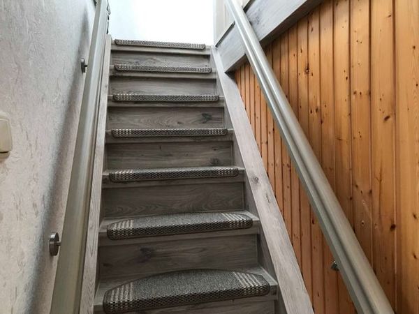 - Im Erdgeschoss: Küche (Küchenzeile mit Kühlschrank, Geschirrspüler, E-Herd, Mikrowelle, Kaffeemaschine, Toaster, Eierkocher, Wasserkocher, Hänge- und Beistellschrank komplett mit Geschirr und Essplatz)