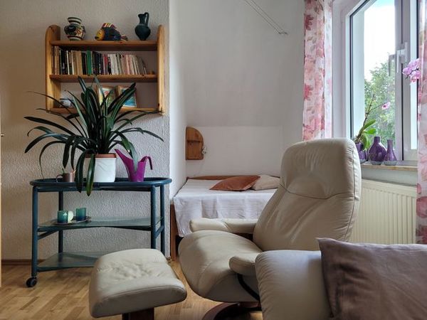 Unsere beschauliche Ferienwohnung II befindet sich in der oberen Etage im Haus des Gastgebers und ist über einen separaten Eingang zu erreichen. Sie verfügt über ein Wohnzimmer mit Schlafnische, Schlafzimmer mit Doppelbett, Küche (mit 2-Plattenherd) und Essbereich sowie einem Bad mit Dusche und WC. Für ein Kind bis 15 Jahre steht eine Schlafmöglichkeit im Wohnzimmer auf der Couch zur Verfügung. Ein Babybett (bis 2 Jahre) kann auf Anfrage zur Verfügung gestellt werden.