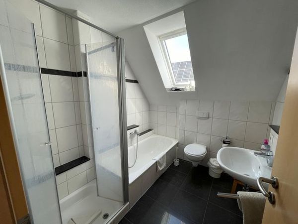 Direkt am Wohnzimmer ist der Balkon. Im Wohnzimmer befindet sich ein großes Sofa, eine Ess-Ecke sowie eine Pantryküche. Das Bad ist mit Dusche und einem Handtuch-Heizkörper ausgestattet.