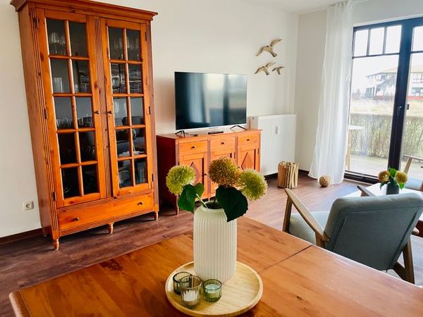 - in der Parterre/Aufzug - möblierte Terrasse - Autostellplatz Nr. 5.4 - Tiefgaragenplatz (Einfahrtshöhe 2,00 m) - Fahrradkeller - Sauna inkl., Waschmaschine u. Trockner gegen Gebühr - Nichtraucherappartement! Keine Haustiere! - WLAN-Bereitstellung kostenfrei (ohne Gewähr) - Wohnbereich mit integrierter Küche und Essplatz - Küchenzeile - Herd mit Backröhre, Mikrowelle, Kühlschrank mit Gefriermöglichkeit und Geschirrspüler - 1. Schlafzimmer mit Doppelbett und Kleiderschrank, TV - 2. Schlafzimmer mit Doppelbett und Kleiderschrank - DU/WC mit separatem WC