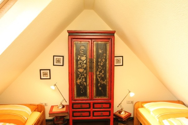Über eine Wendeltreppe gelangen Sie in einen geräumigen Wohnflur des DG, von dem drei Schlafräume abzweigen. In dem Wohnflur befindet sich eine weitere gemütliche Sitzgelegenheit, darüber hinaus zweigt von hier ein weiterer Balkon mit Relaxliege ab. Alle Räume im DG haben Dachschrägen. Zwei Schlafzimmer sind mit Ehebetten (1,80x2,00) und eins mit Einzelbetten ausgestattet.