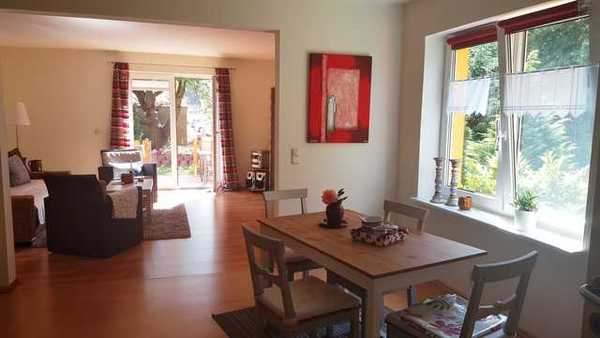 Die 2-Raum-Ferienwohnung ist ca. 60 qm groß und befindet sich im Erdgeschoss des Hauses. Die möblierte Terrasse ist vom Wohnzimmer aus begehbar, davor befindet sich eine zusätzliche Sitzecke im Garten mit einer Grillmöglichkeit. Das Wohnzimmer ist ausgestattet mit TV, Radio mit CD-Player, Sideboard, einer ausklappbaren Rattan-Couch (Liegefläche 1,80 x 2,00m), sowie Esstisch mit Stühlen. Die offene Küchenzeile ist ebenfalls im Wohnzimmer integriert. Sie verfügt über eine Kühl- und Gefrierkombination, 4-Platten-Ceranherd, Backofen, Mikrowelle, Wasserkocher und Kaffeemaschine. Vom Wohnzimmer hat man einen Blick ins Grüne. Im separaten Schlafzimmer steht Ihnen ein Doppelbett zur Verfügung. Bad mit DU/WC. Ein Kinderreisebett (Baby) und Hochstuhl ist auf Anfrage kostenfrei erhältlich, bitte vorbestellen. Die Erstausstattung Bettwäsche ist inklusive. Handtücher sind mitzubringen.