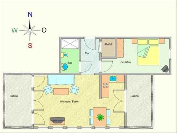 Damit haben Sie einen herrlichen großen Raum von knapp 30qm, der hell und lichtdurchflutet ist und an zwei Seiten von Balkonen flankiert wird, auf denen Sie den ganzen Tag die Sonne genießen können (Südwest- und Südost-Lage). Neben dem Wohnzimmer mit Pantry und Essecke besteht die Wohnung aus einem ca. 15 qm großen Schlafzimmer mit Doppelbett, einem Bad mit Dusche und WC, einem Flur sowie einem kleinen Abstellraum für Ihre Gepäckstücke. Im Wohnzimmer befindet sich eine Schlafcouch. Die Küchenecke ist mit Herd, Backofen, Geschirrspüler und Mirkowelle. Toaster, Wasserkocher und Kaffeemaschine ausgestattet.