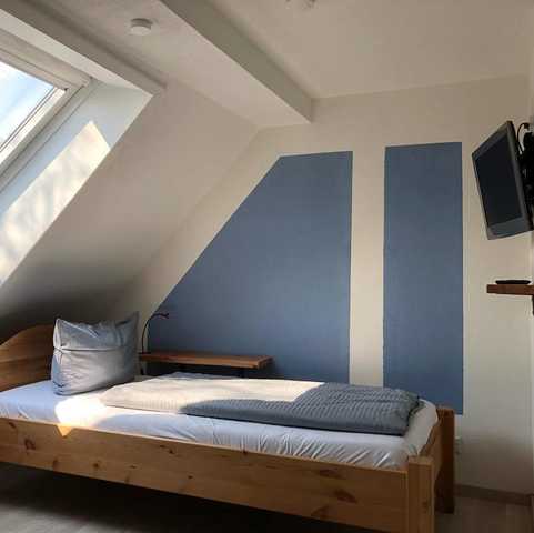 Das Einzelzimmer in der Pension Haus Hohensee befindet sich in der 2. Etage im Dachgeschoss. Ein Waschbecken ist im Zimmer. Eine Etage tiefer befindet sich ein Badezimmer mit Dusche und WC zur alleinigen Nutzung.