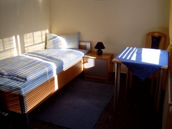 Die modern möblierte 15 qm-Nichtraucher-1-Zimmer-Ferienwohnung in der 1. Etage für 1 Person ist mit Teppichboden, SAT-TV, Telefon sowie WLAN-Verbindung ausgestattet. Bei Bedarf einer Verschluss-Möglichkeit für Wertgegenstände sprechen Sie uns bitte an. Waschmaschinen- und Trocknernutzung, Bügeleisen und Bügelbrett sowie eine separate Trockenmöglichkeit stehen zur Verfügung. Informationen über die Region und diverse Veranstaltungen finden Sie in einer Mappe. Für Raucher steht jederzeit unser Gemeinschaftsraum zur Verfügung.