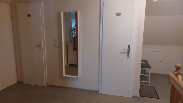 Ihr Doppelzimmer (Waldblick - Nr. 2) zur Waldseite hat ca. 20 qm. Aus baulichen Gründen befindet sich die Dusche direkt im Schlafraum und ein eigenes WC befindet sich auf dem Flur. Ebenfalls befindet sich auf der Etage eine Gemeinschaftsküche mit Sitzgelegenheit.