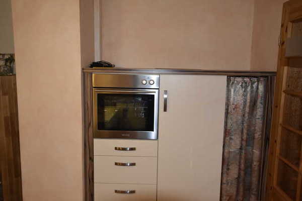 Liebevoll und neu renovierte 3-Raum-Ferienwohnung. Eingangstür im EG, über den kleinen Flur und Treppe gelangt man ins OG. Das Wohnzimmer ist ausgestattet mit Couch, Esstisch, Stühlen, Sat.-TV, DVD Player und Radio. Die Küche, integriert im Wohnzimmer, ist ausgestattet mit 4-Plattenherd, Backofen, Toaster, Kaffeemaschine, Wasserkocher und Kühlschrank.