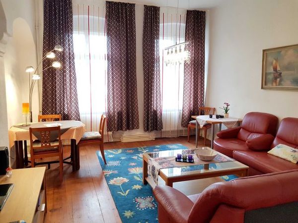 Die Zweizimmerwohnung hat eine herrschaftliche Raumhöhe von 3,30 m. Das Wohnzimmer mit Rundbögen und Zierelementen an den Wänden ist mit einer komfortablen Ledergarnitur ausgestattet. Die Ledergarnitur verfügt über viele Funktionen, Drehsessel mit Armlehnen, Rückenpandelo und sie kann ausgezogen werden und bietet dann eine Schlaffläche von 1,20 m Breite und 2 m Länge. Die sehr hochwertige Küche ist komfortabel ausgestattet mit Spülmaschine, Kaffeemaschine, Wasserkocher, Toaster. Das Schlafzimmer verfügt über ein besonders breites Bett. Unseren Gästen steht ein kostenfreier WLAN-Internetzugang über Mobilfunk zur Verfügung (unbegrenztes Datenvolumen).