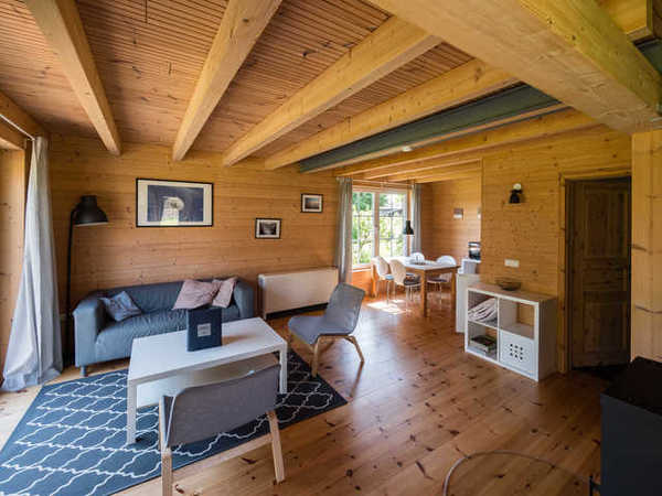 Die zwei separaten Schlafzimmer (eine Aufbettung pro Schlafzimmer möglich) befinden sich im Obergschoss. Sie sind über eine normale Treppe zu erreichen. Der großzügige Wohnraum im Erdgeschoss ist mit Kaminofen, Nachtspeicherheizung und einem Esstisch mit 4 Stühlen ausgestattet.