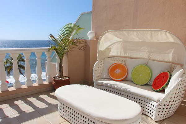 - Highlight: Große, L-förmige Dachterrasse mit Sonnenmarkise, möbliert mit: modernem Loungesofa, 2 Sonnenliegen, Esstisch für 4, Super-Meer- und Strandblick ca. 40qm