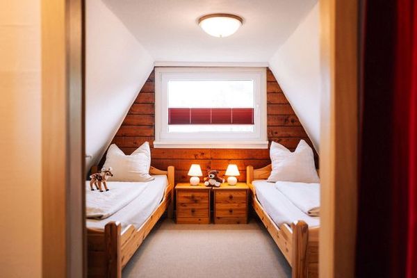 Eine steile Raumspartreppe führt zu den zwei Schlafräumen - ein Schlafzimmer mit Doppelbett, ein Schlafzimmer mit zwei Einzelbetten. Die Bettwäsche ist inklusive. Handtücher bitte mitbringen!