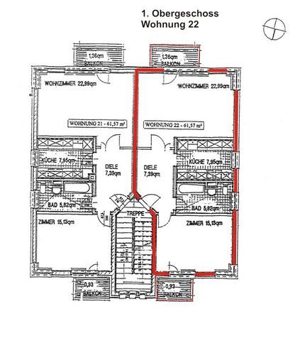 Ferienwohnung für 2-4 Personen (ca. 62 m²) im 1.OG mit Wohn- und Esszimmer, Schlafzimmer, Küche, Bad und 2 Balkone.