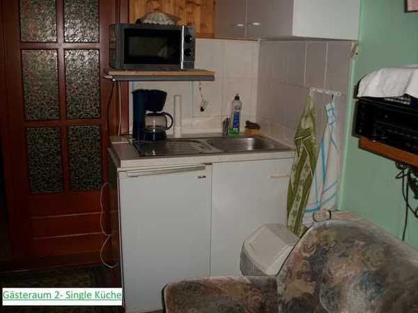 Der Gästeraum besteht aus einem Zimmer, ca. 18 m², mit Einzelbett und ausziehbarer zweiten Liegefläche, sowie einer eingebauten Küche.