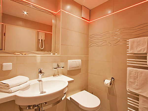 - Bad mit Dusche und WC sowie extravaganter LED-Beleuchtung