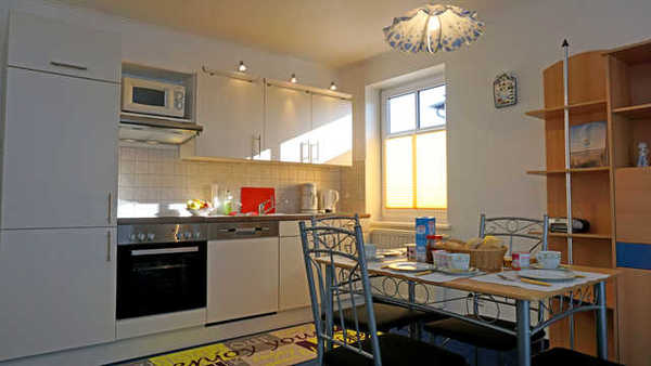 Die Ferienwohnung befindet sich im schönen frisch renovierten Haus" Antje" im 1. OG. Das gemütliche, komplett eingerichtete Wohnzimmer mit Couchgarnitur (Schlafcouch) und Küchenzeile lässt keine Wünsche offen. Das Schlafzimmer ist mit einem Doppelbett ausgestattet (genügend Platz für Babybett vorhanden). Das großzügige Bad ist ausgestattet mit Badewanne, Waschtisch und WC.