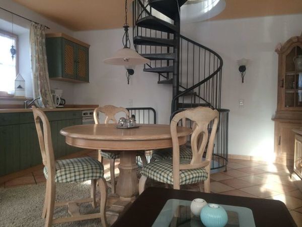 Wendeltreppe: im Erdgeschoss befindet sich die Wohnküche mit Ecksofa