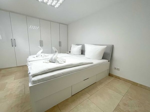 * Großer Wohn-/Schlafraum mit Doppelbett, Kleiderschrank, Flachbild-TV 58 Zoll,