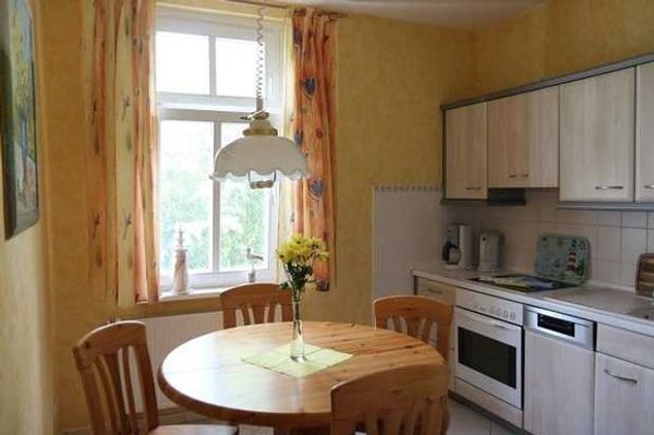 Geräumige und modern eingerichtete Ferienwohnung im Hochparterre (Anbau an der Villa) auf einem abgeschlossenen Grundstück. Die sanitäre Einrichtung besteht aus zwei Duschen sowie einem WC. Die überdachte Terasse lädt auch bei schlechtem Wetter zum Verweilen ein. Für die kleinsten Gäste kann bei Bedarf ein Kinderreisebett und ein Hochstuhl bereitgestellt werden. Einen gemütlichen Fernsehabend verspricht der digitale Fernseher. Und läßt das Fernsehprogramm zu wünschen übrig, können auch DVDs ausgeliehen werden. Internetzugang (WLAN) ist in der Wohnung vorhanden.