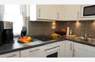 In der Küche, die durch eine Schiebetür vom Wohn-/Schlafraum getrennt ist, finden Sie die vollständige hochwertige Markenausstattung für ihren Aufenthalt. Daran schließt sich im Wohn-/Schlafraum ein großer Esstisch an.