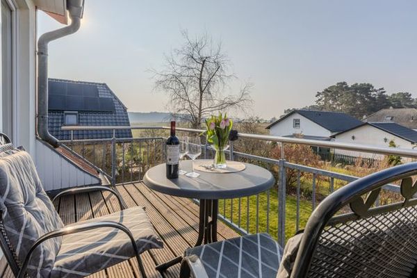 Die Dachgeschoss-Wohnung Margarete ist großzügig geschnitten, ausgesprochen hell und freundlich gestaltet. Vor dem nach Süd-Westen ausgerichteten Wohnzimmer befindet sich ein geräumiger Balkon. Von diesem können Sie nicht nur zum Sonnenuntergang tief durchatmen und einen traumhaften Blick über die angrenzenden Wiesen auf das Achterwasser genießen.