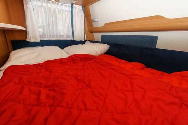 Moderner Wohnwagen mit Schlafmöglichkeiten für zwei Erwachsene und zwei Kinder bzw. Jugendliche. Es ein  französisches Bett vorhanden. Für die Kinder bzw. Jugendlichen sind Doppelstockbetten vorhanden, die bis 160cm und 65kg bequem genutzt werden können. In den Wohnwagen sind Toiletten vorhanden. Weitere Toiletten und die Duschen befinden sich separat im Sani-Haus.