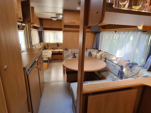 Moderner Wohnwagen mit Schlafmöglichkeiten für zwei Erwachsene und zwei Kinder bzw. Jugendliche. Es ein  französisches Bett vorhanden. Für die Kinder bzw. Jugendlichen sind Doppelstockbetten vorhanden, die bis 160cm und 65kg bequem genutzt werden können. In den Wohnwagen sind Toiletten vorhanden. Weitere Toiletten und die Duschen befinden sich separat im Sani-Haus.