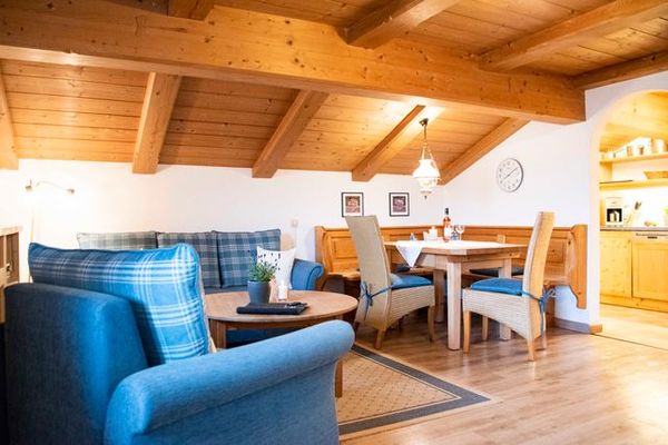 Unsere großzügige Ferienwohnung 'Troadkasten' befindet sich im Dachgeschoss, ist 60 m² groß und ist für 2 Personen geeignet. Vom Balkon mit Morgensonne lässt sich der traumhafte Berg- und Seeblick genießen.