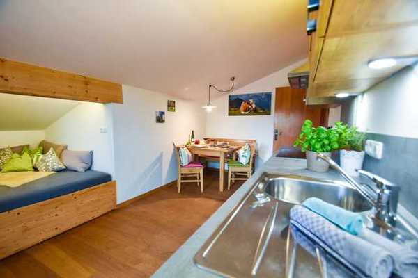 Das Doppelbett sowie die 180/200 Couch in der Wohnküche( in Bayern auch "Gflagg" genannt) sind in die Dachschrägen eingebaut und garantieren so einen heimeligen Schlaf und gemütliche Stunden. Um einen angenehmen Schlaf geniessen zu können, verfügen Schlafzimmer und Wohnküche über Verdunkelungsvorhänge