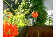 Hochparterre, 34 m², Wohnzimmer (Echtholzboden) mit kleiner Kochecke und zusätzlicher Schlafcouch, Schlafzimmer mit 2 Einzelbetten, Bad/WC, Gartenterrasse mit eigener Gartenecke und überdachter Sitzgruppe. Die Wohnung ist nach Süden ausgerichtet, völlig ruhig in einem kleinen Anbau mit freiem Blick in den Garten und die Berge.