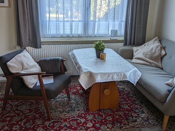 Im gefliesten Wohnzimmer sind eine Sitzgruppe mit Couch, Sessel, ausziehbarem Couchtisch und eine Schrankwand mit Schrankklappbett. Handtücher, Küchentücher und Bettwäsche werden gestellt und wöchentlich gewechselt.