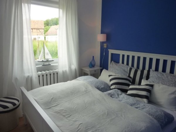 Im blauen Schlafzimmer träumen Sie in einem 1,80 m breiten Bett. Eine zuzätzliche Schlafmöglichkeit steht Ihnen im Wohnzimmer mit der ausziebaren Couch zur Verfügung. Bettwäsche ist natürlich inklusive.