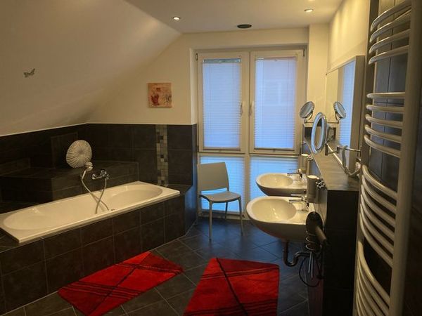 Das Highlight der Ferienwohnung ist das Badezimmer mit separater Dusche und Badewanne, die als Wasserstrahldüsen für eine entspannende Rückenmassage dienen.