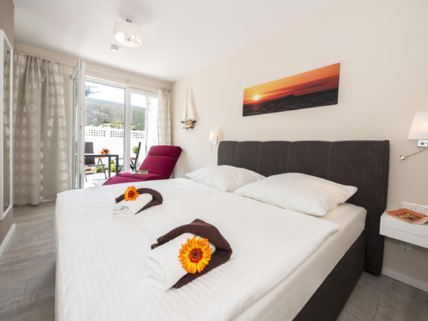 Dieses 2-Zimmer-Appartement liegt im Erdgeschoss und eignet sich mit seinen 58 m² (inkl. Terrasse) für 2-4 Personen. Die lichtdurchflutete und modern eingerichtete Wohnung bietet eine gemütliche Atmosphäre. Der kombinierte Wohn- und Kochbereich ist mit einem großen Esstisch und einer hochwertigen Küchenzeile inkl. Geschirrspüler, Cerankochfeld, Backofen, Mikrowelle etc. ausgestattet, die keine Wünsche offen lässt. Vom Wohnzimmer gelangen Sie auf die große sonnige Terrasse im Grünen, die neben einem Esstisch auch mit Sonnenliegen möbliert ist. Von der gemütlichen Couch mit Schlaffunktion inkl. Lattenrost und Matratze können Sie vor dem Flachbildfernseher mit integriertem Radio und DVD- Player entspannen oder einfach die grüne Aussicht genießen. Im hellen Schlafzimmer steht für Sie ein Boxspringdoppelbett (180x200) und ein geräumiger Schrank sowie eine Liege zum Relaxen bereit. Das komfortable Badezimmer verfügt über eine Echtglas-Dusche mit bodengleicher Duschtasse und einer Infrarotsauna mit Entspannungsmusik und Farblicht. Hier finden Sie ihre private kleine Wellness-Oase, die gerade an kühleren Abenden eine wohlige Wärme und Erholung für Körper und Seele schafft. Der inklusive Pkw-Stellplatz ist im nahegelegenen und 24 h bewachten Parkhaus.