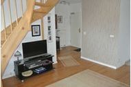 Die funktional gestaltete Ferienwohnung in der 2. Etage hat einen offenen Wohnbereich mit Küchenzeile und Essbereich, ein Schlafzimmer mit Doppelbett, FlachbildTV, Kleiderschrank und einer kleinen Sitzecke (über Treppe im Wohnbereich zu erreichen), ein Gästezimmer mit Einzelbett, Nachttisch und kleinen Kleiderschrank. Die funktionale Küchenzeile ist mit 2-Platten-Ceranfeld, Kühlschrank mit Gefrierfach, Mikrowelle, Kaffeemaschine, Wasserkocher, Toaster und div. Geschirr ausgestattet. Ein Bad mit Dusche, Waschbecken und WC komplettieren den guten Gesamteindruck der Wohnung.