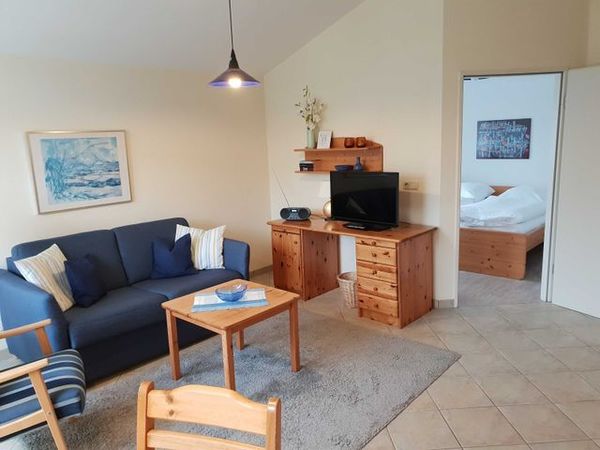 Nur 150 m vom Strand wohnen Sie in einer 2-Raum-Ferienwohnung. Die 39 qm große Wohnung liegt in der ersten Etage. Das Wohnzimmer ist mit einer Couch, Couchtisch, Sessel, Anrichte, mit Kabel-TV (Flachbildschirm), Radio, Essbereich (Tisch und Stühle) und Küchenzeile ausgestattet. Der Balkon mit Tisch und Stühle geht zur Südseite. Im Schlafzimmer stehen ein Doppelbett und eine kleine Anrichte. Die Küchenzeile wurde ausgestattet mit Mikrowelle, Kühlschrank, Kaffeemaschine, Zwei-Platten-Kochfeld, Toaster und Wasserkocher. Das Bad mit Dusche und WC komplettiert die Wohnung.