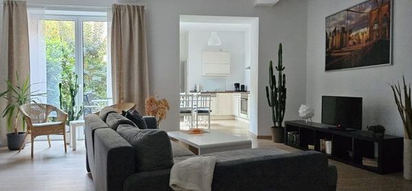 Die Nichtraucher-Ferienwohnung im Erdgeschoss bietet auf 90 m² Wohnfläche einen hellen und großzügig eingerichteten Wohn- und Essbereich mit einer modernen Einbauküche, zwei Schlafzimmern, Badezimmer sowie eine Terrasse im grünen Innenhof und bietet somit Platz für 2 bis 4 Personen.