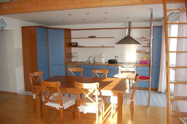 Die Ferienwohnung besteht aus 2 Schlafzimmern mit jeweils einem Doppelbett, einem Schlafboden in dem Platz für 2 Personen ist, sowie einem Wohnzimmer mit Schlafcouch. Somit haben insgesamt 8 Personen Platz. Im Wohnzimmer befindet sich ebenso die großzügige Küchenzeile und Essecke. Das Bad verfügt über WC und Dusche.