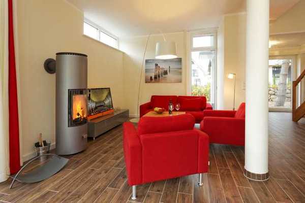 - großzügiger Wohn/ Essbereich (ca. 42 m²) mit gemütlicher Sitzgruppe, großem Esstisch für 6 Personen, Kamin, Loewe Flachbildfernseher (ca. 120cm Bilddiagonale) mit Internetzugang (24000 kbits/s) und Loewe Soundsystem, sowie 3D-Blue-Ray-Player