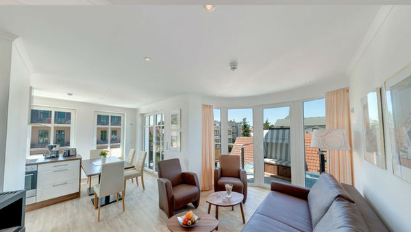 SEEBLICK! MODERN und mit 2 DACHTERRASSEN, FAHRSTUHL, nur ca. 100 m zur Strandpromenade! Komfortabel eingerichtete 3 - Zimmer - Wohnung mit sehr guter Ausstattung! 2 separate Schlafzimmer, 2 Bäder (1 Dusch- und Wannenbad ensuite, 1 Duschbad) , Wohnbereich, Küchen- und Eßbereich, 2 möblierte Dachterrassen mit je 22 qm Fläche, eine davon mit eigenem STRANDKORB, KAMINOFEN, FUßBODENHEIZUNG. Die Wohnung nimmt das gesamte Dachgeschoß des vorderen Hausteils ein. Die Wohnung verfügt über einen Pkw-Stellplatz in der hauseigenen Tiefgarage. Fahrradabstellfläche ist vorhanden. Vom Haus aus können Sie das Ortszentrum und die bekannte Ahlbecker Seebrücke in ca. 2 Minuten zu Fuß erreichen.