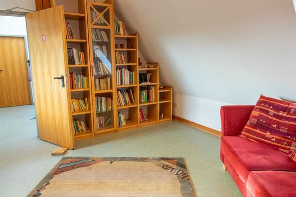 Im 3-stöckigen 170 m² großen mit Lehm ausgefachteten Fachwerkhaus ist Platz für bis zu 14 Personen. Die vordere Eingangstür ist über eine Rampe erreichbar. Im Erdgeschoss des Ferienhauses befindet sich der große Aufenthaltsraum mit vielen Sitzmöglichkeiten und einem TV. Die offene Küche ist mit einem Herd, Backofen, Kühlschrank und einer Spülmaschine ausgestattet. Geschirr, Besteck, eine Kaffeemaschine und ein Wasserkocher sind ebenfalls vorhanden. 2 Gäste-WC vervollständigen diesen Bereich. Außerdem befindet sich im Erdgeschoss ein behindertengerechtes Schlafzimmer (zwei getrennte Betten, 90x200cm) mit rollstuhlgerechtem Badezimmer, welches mit einer befahrbaren Dusche, Duschsitz, Waschbecken und WC eingerichtet ist. Über eine Treppe erreicht man die erste Etage. Dort befinden sich die vier weiteren Schlafzimmer (1x Zweibettzimmer, 2x Dreibettzimmer, 1x Vierbettzimmer, jeweils 90x200). Alle Schlafzimmer verfügen über einen Kleiderschrank, Tisch und Stühle. Zu jedem Schlafzimmer gehört ein Bad mit Dusche, Waschbecken und WC, zwei davon sind über den Flur erreichbar. Ein Zustellbett steht zusätzlich zur Verfügung. Im Dachgeschoss gibt es einen weiteren Aufenthaltsbereich mit Sitzmöglichkeiten, Büchern und Flachbild-TV. Am hinteren Ausgang schließt sich eine Terrasse mit Holzbänken, Grillmöglichkeit, Feuerstelle und eine große Wiese an.