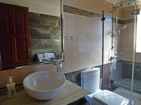 Im linken und rechten Flügel des Hauses befinden sich jeweils ein Schlafzimmer und ein Bad. Die beiden Schlafzimmer sind großzügig geschnitten, Kronleuchter schaffen ein besonderes Ambiente. Auf der kleinen Sitzbank am Fenster oder im Schaukelstuhl können Sie sich niederlassen um gemütlich ein Buch zu lesen. Beide Schlafzimmer haben durch Schiebetüren einen direkten Zugang zur Terrasse.
