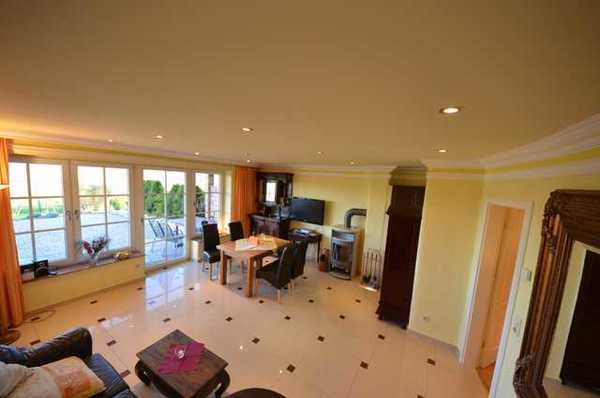 Großzügiges Wohn-/Esszimmer mit Ausgang zur großen 80 m² Terrasse. Schöne Ledergarnitur mit Opiumtisch, große Fensterfronten mit direktem Blick auf die Ostsee, den kleinen Hafen von Groß Zicker und die gegenüber der Bucht liegenden Orte Thiessow und Klein Zicker. Esstisch mit vier Stühlen, großer Hark-Kaminofen, antiker Geschirrschrank, Plasma-TV mit 113 cm Großbild, Fußbodenheizung, DVD-Recorder, Stereoanlage, CD-Player, Kinderhochstuhl, Wände dekoriert mit Spiegeln und Gemälden, sehr ansprechende Beleuchtung
