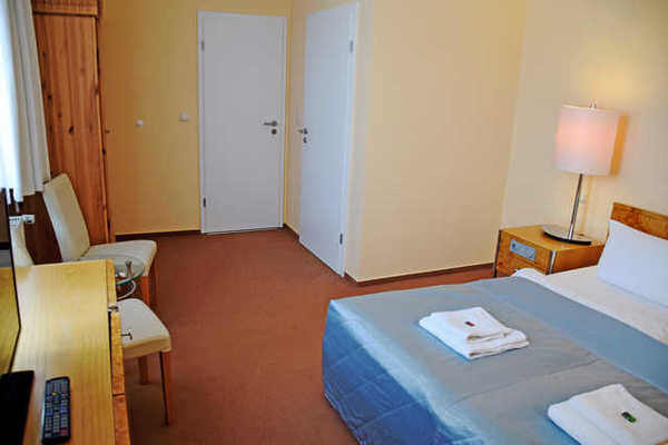 Dieses Doppelzimmer ist 20 qm groß und für max. 2 Gäste und ein Kind im Kinderreisebett modern und freundlich eingerichtet. Angenehme Farben, bequeme Möbel und großes Fenster lassen bei Ihnen schnell ein Urlaubsgefühl aufkommen. Zu Ausstattung gehören ein bequemes Doppelbett, ein Kleiderschrank, Minibar, Stühle und Tisch und ein Flachbild-TV mit Radio. Ein Kinderreisebett mit Bettwäsche kann auf Wunsch gern bereitgestellt werden.