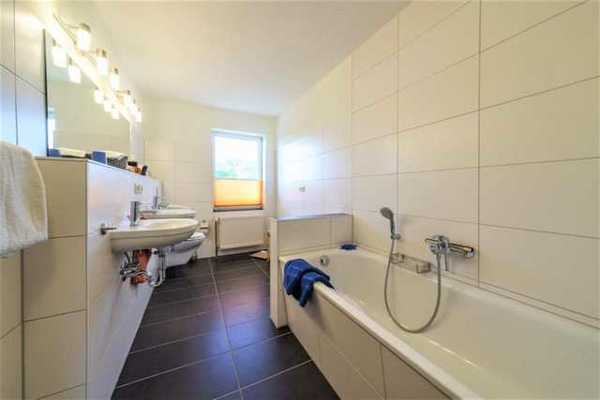 Das großzügige Bad verfügt über eine Badewanne mit Duschabgrenzung, WC und einem Haarföhn sowie zwei Waschbecken.