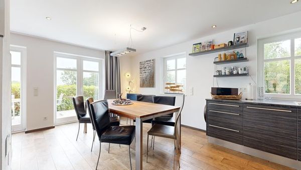 Großer, heller Wohnbereich (58 m²) mit Couchecke, Sat-TV, Kamin, Esstisch und Küchenbereich (Spülmaschine, Herd, Gefrierkombi, Wasserkocher, Kaffeemaschine, Toaster)