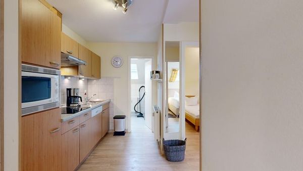 separate gut ausgestattete Küche mit einem Induktionskochfeld, Spülmaschine, Mikrowelle, Kaffeekapselmaschine, Wasserkocher, Toaster