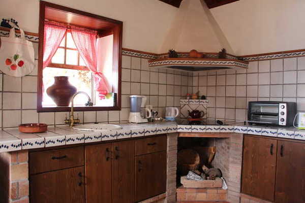 Der Wohnbereich wurde schlicht gehalten mit einer schönen alten Holztruhe, einen Sofa mit großem Sat-TV (Flachbildschirm) und einem Esstisch mit 2 Stühlen. Auch in der Küchenzeile tauchen wieder Dekoelemente aus alten Zeiten auf und geben dem Haus seinen eigenen Charme. Die Küchenzeile ist gut ausgestattet, auch vom Küchenfenster hat man Blick auf das Meer.