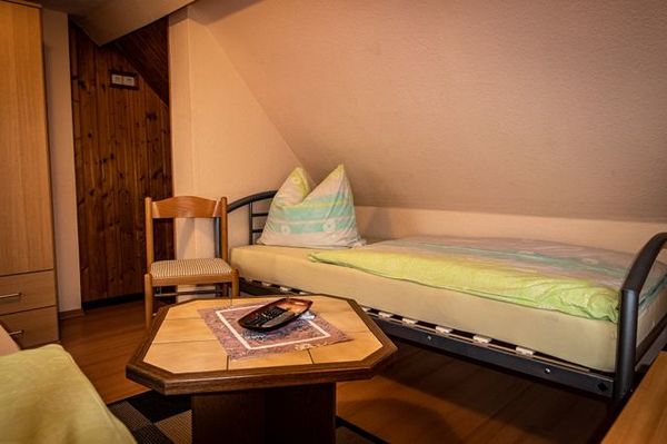 Über eine steile Treppe (nicht alters- und behindertengerecht!) gelangt man im Obergeschoss in den Wohn-Schlafraum, welcher mit 2 Einzelbetten, Tisch, 2 Stühlen, Kabel-TV und einem Waschschrank eingerichtet ist. Bei Bedarf kann man die beiden Betten auch zusammen stellen.