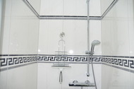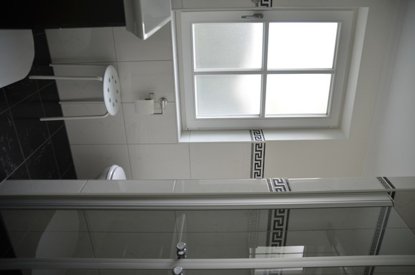 Das Tageslicht-Duschbad im Erdgeschoss mit bodengleicher Duschwanne und großem Fenster ist geschmackvoll und hochwertig gefliest, mit einem Handtuchtrockner, Föhn und mit umfangreichen Unterbringungsmöglichkeiten für Ihre Utensilien ausgestattet.